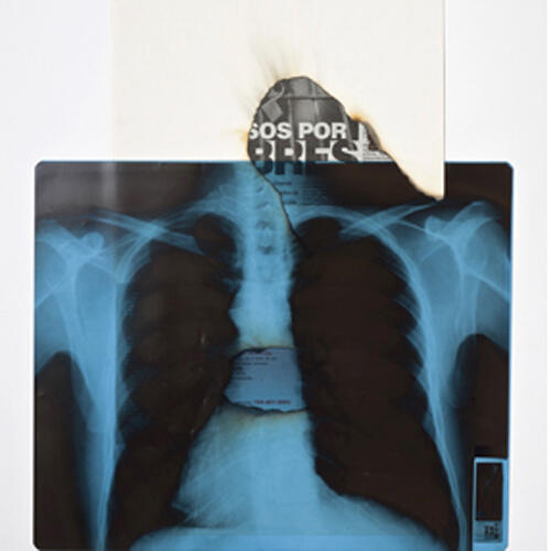 At D21 Gallery, she will present works from a series that crosses images of different scopes: images that register situations that the artist had to live, with during her stay in Argentina, such as the manifestations at the Plaza de Mayo, from the “piqueteros”, and photographs that she took of homeless individuals sleeping in the streets. Along with these images, we see radiographies of intoxicated lungs, maps, newspaper fragments, and her characteristic seams. In this way, continuing her poetry, the artist provokes us with these works, stressing the referential images and forcing a new reading of them.