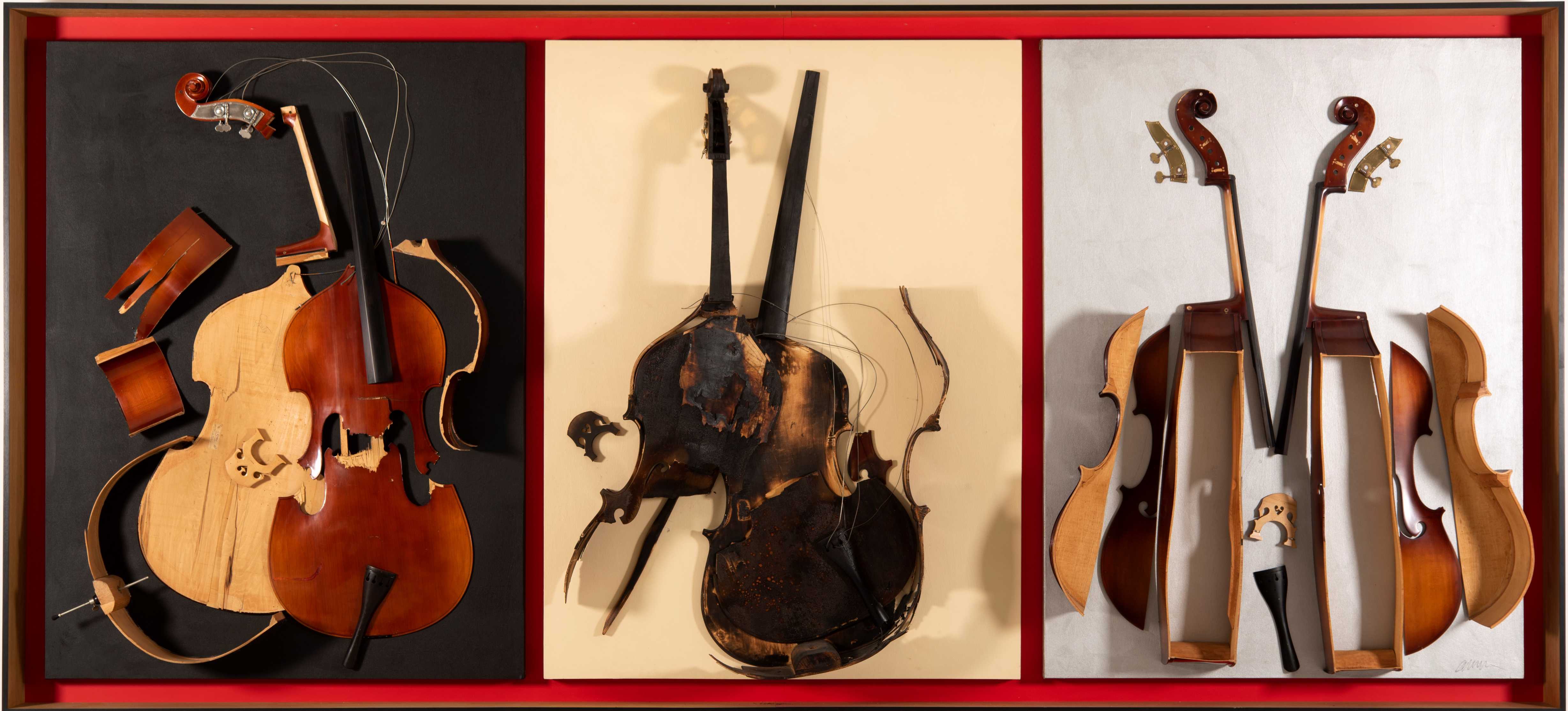 In 1961, Arman performed the first of his "Angers": Colère, with a double bass exploded on a wooden panel. The sequel of works that resort to the destruction of a musical instrument comes from that piece of intense gestures and its ability to reconceptualize the memory of sound in a visual piece. In 1962, he created his iconic Chopin's Waterloo in a performance in which he destroyed a piano that he would rearrange over vast red wood-framed. Ascaso Gallery brought from Manhattan an extraordinary large-scale, untitled triptych, created in 2004, a year before his death. Rosemary O'Neill describes it this way: "Each panel comprises a single bass violin ordered by a sequence of artistic operations - breaking, burning and splitting - in a format that evokes the history of religious art in the West (...)". Each shattered double bass achieves a high visual, emotional, and tactile resonance: Arman rearranges the strings, the undone wood forms transform into powerful abstract expressions, but keeps the awareness of the previous destruction intact and unleashes an unexpected form of poignant beauty. Also because, as O'Neill points out, “due to its scale, the standing double bass is comparable to the human body”. At the same time, the dismemberment of the violin is connected to surrealist practices and that relationship between the musical instrument and the human body, preceded by one of Man Ray's most famous photographs: Ingres's Violin, 1924.