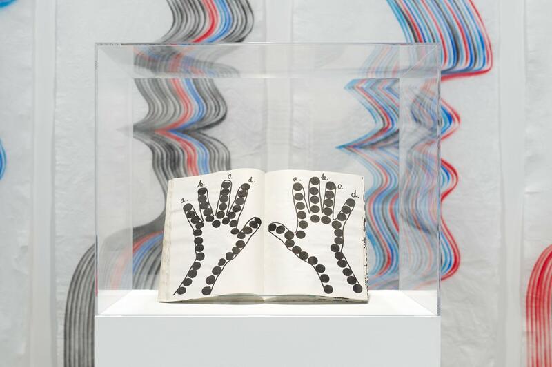 The artworks follow the transformation of the written word into choral music and the subsequent translation of music into graphic symbols. Amorales’ six-channel video installation evokes ideas of the sublime through chants. This major work portrays musician, composer, and performer Sarmen Almond singing two poems and the myth of the serpent. As a counterpoint, percussionist Diego Espinosa performs a series of dancefloor rhythms with his hands and body. In another video the hands of the artist are shown browsing through a notebook in which he developed an idiosyncratic system of signs and symbols for conducting choirs. The drawings in this notebook were inspired when seeing a choir director gesticulate with her hands, arms and body. The artist imagined these movements as drawings in the air.