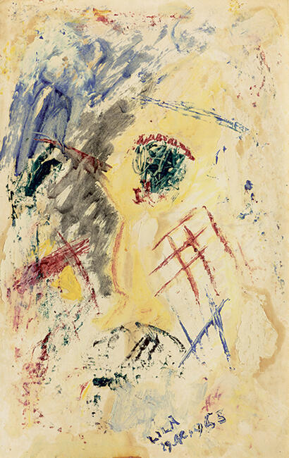 Lisa’s work from 1940 to 1954 shows an extraordinary formal leap from the earlier multi-angled, overlapping geometric forms to a vibrant, painterly organic abstraction. (Ill. 3) From 1940 through 1952, Lisa titled his works Compositions, and in 1953 he referred to them as Playing with Lines and Colors. With those paintings, Lisa hit his stride and maintained it until he stopped painting in 1978 when his wife became ill. Each small-scale work features lines crossing, darting, and overlapping, each imbued with a sense of musicality, even dance: one feels as if the lines, dots, dabs, irregular shapes, and squishes of paint will take flight beyond the limits of the paper’s edges. (Ill. 4) Some of these may bring to mind similar formal expressions in Joan Mitchell’s pastels on paper from the mid-1970s.