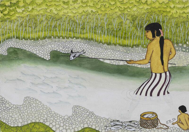 Gerardo Petsain Sharup. Nayap, el gran pescador. Acuarela en papel canson manival. Cortesía de MALI