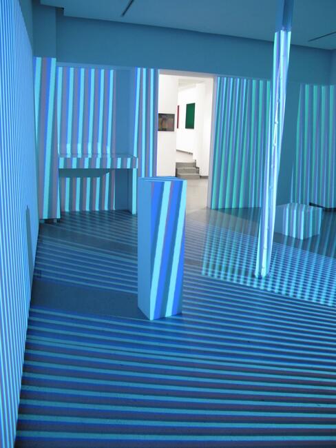 After all these years, the artist definitely knows how to surprise his audience. The show opens to Environnement Chromointerférent (1964-2010), a room that becomes unstable via moving lines of colored light that meet at its center. By the time visitors walk to the next room, they notice that the disturbing effect is not only valid in and on the space, but that all forms present in the room, including themselves, lose their assumed formal definition and become moving volumes even when not moving at all.