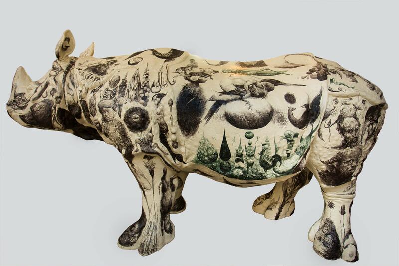 The exhibition spans nearly a decade of Fabelo’s work, highlighting twenty drawings on printed paper — selected from over 150 displayed works — that showcase his remarkable illustration technique. It also underscores his versatility in the use of materials and surfaces, including paper, silk, Kraft paper, and even large-scale sculptures—such as the imposing rhinoceros at the exhibition’s entrance.