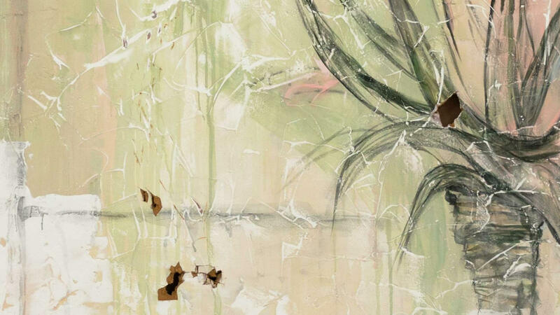Cacti are full blown images in several large scale paintings in the exhibition. The plants are eye-catching and insistingly notable. (As an aside, I was also captivated by the presence of real cacti located in different places on the gallery’s floor. They reified the visual and conceptual relationship to the painted motifs.) Other Landscape II features two large cacti on the sides of two wooden panel doors. The diptych begs to be opened. The mottled, painterly pink surface, overlayed numerous times with layers of plaster and acrylic obscures many hand-drawn images conjuring a sense mystery. Who lived behind the doors? Where do they lead? What is the meaning of their isolation? At first glance, the overall impression is that the painting is an unusually beautiful landscape. At closer inspection however, we notice the many small punctures on the surface, reminding us of rupture and damage. In the context of a landscape, the motif of the cacti is unusual. Since cacti need very little water to survive, they are perceived as being hardy. Since cacti need very little cultivation to grow, they are self-maintaining. Since cacti grow in harsh landscapes, they are resistant.