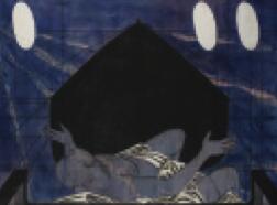 With versatility, moving across painting, video and installation, he also nourished his production with references to literature, philosophy and a critical gaze on present day society nuanced by an existentialist tone, without ever ceasing to refer to painting and its history. “Sombras de la modernidad” (Shadows of Modernity) is comprised of fourteen large format canvases tending towards monochromy, tensioning the graphic and the pictorial. In red, blue or yellow tones, on washes or layers of pigment, the line draws vanishing points, faraway horizons and rigorous compositions featuring bodies, spread out bed sheets, ships small sailboats, houses or beds and maps, nautical charts or road layouts. It includes three series: “La Nave de los locos” (The Madmen’s Ship), “El continente” (The Continent) and “El desnudo en la historia del arte” (The Theme of Nude in Art History). Subjects that he has always found disquieting navigate along these fragmentary images of an archetypal character: the journey, madness and death. They involve, above all, the presence of the human body in terms of geographic anatomy unraveling itself barely as a sketch, a trace, an icon that captures the gaze. Beside a wall, the only object outside the painting rests under the monumental projection of a close-up of the water. There is no possible horizon, only the motionless boat, the calm sea, and the silence of the end of the journey.