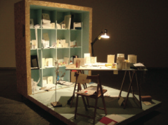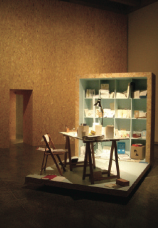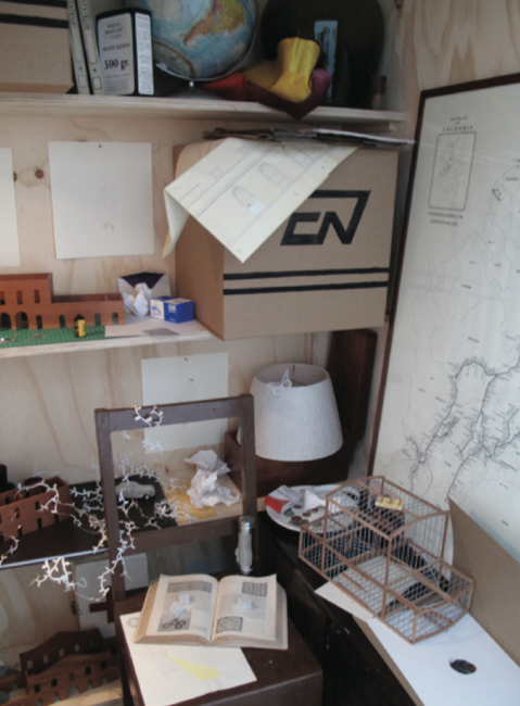 López’s skepticism regarding the art object allows him to exhibit a lightness which is neither cynical nor devoid of hope, and which is reminiscent of Calvino’s proposals. In his simulations, in his plays with inside and outside, right or wrong side, or in his way of combining the external space and the mental space, there is a permanent invitation for the spectator to delve into the intimate as something inseparable from the “seams” between art and reality. At Casas Riegner Gallery in Bogotá, López installed a replica of his workshop which included not only its tables, work materials and drawings in progress, but also his own presence with the aim of mounting the exhibition before the eyes of the public during the month assigned to this end. Instead of transforming the family home into the artwork, like Kurt Schwitters did with his Merzbau, López altered the gallery space, transforming it into a mirror- workshop in which he transgressed the solitary atmosphere of creation and thus revealed it.