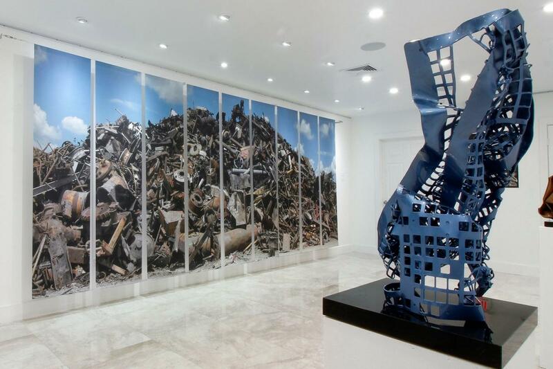 Castellanos’s photography gets the most out of a particular trait of the resources inherent to photographic construction: its possibility to embellish any referent. If garbage dumps are and cannot be anything but informal heaps—in the case of this photography, metal dumps, including auto parts, home appliances and others—the photographer chose to act on them by applying certain mutually related artistic operations: the search for the form within the formless, its localization and isolation. Each image in the Pac-Man Sushi’s and Cumulus poliptychs, both made between 2018 and 2019, evidences this operation and, at the same time, the manifestation of a specific mode of existence of form. That exploration on form should be understood, besides, as a simultaneous investigation on colors and textures of waste, which altogether bestows on the photographs an amazing visual sumptuousness. Part of this endeavor is also The Large Cumulus, 2019, a photograph printed on an enormous canvas divided into nine vertical strips, representing the semi-pyramidal form of a dump. In general, a concern for the beauty of waste, expanded to ready-mades, crosses the whole set of exhibited works and becomes a communicative thread between them.