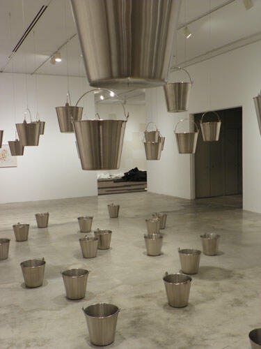 In the installation Rain Rains, 2002, water leaks through tiny holes from a series of buckets suspended from the ceiling and collects in another set of buckets resting on the floor, forming a soft rainfall which must be cyclic and incessant, but which requires the intervention of the museum assistants to empty the water collected in the floor buckets back into the hanging buckets so that the rainfall cycle may start anew.